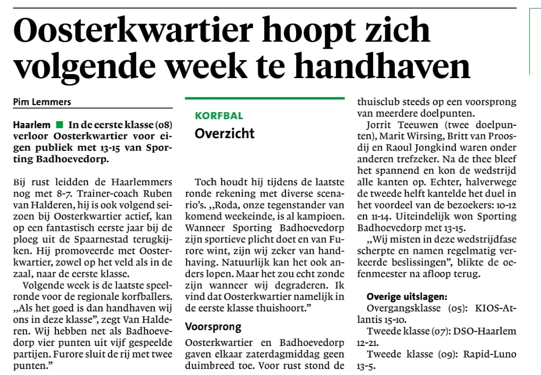 Door de verrassende winst van Dunas tegen Sporting Trigon werd duidelijk dat Rapid zich gehandhaafd heeft in de tweede klasse. Ook doordat Dunas won, geeft het Rapid de kans om volgende week misschien zelfs kampioen te worden. Ze moeten dan winnen van, je raadt het al, Sporting Trigon. Dit belooft een hele spannende wedstrijd te worden. En als je het mij persoonlijk vraagt, zou dit echt de kers op de taart zijn van dit seizoen.